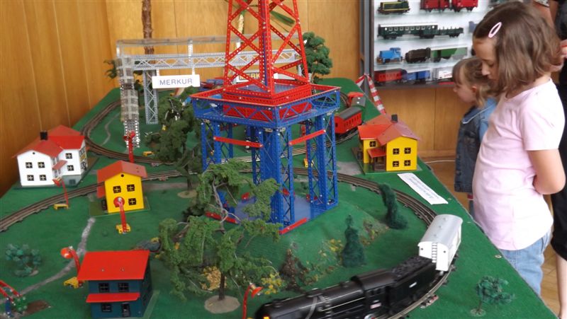 Výstavu v Náchodské škole T.G. Masaryka připravilo Modelářské centrum z České Skalice, které provozuje modelářský kroužek pro děti od 7 let. Dětský modelářský kroužek navštěvuje 20 mladých modelářů, pro které jsou výstavy a soutěže možností pochlubit se svojí činností. Pouhý týden před výstavou jsme se úspěšně zúčastnili modelářské soutěže v Červeném Kostelci, odkud jsme si přivezli několik ocenění. Ale jak to vše začalo... . Myšlenka uspořádat výstavu vláčků v Náchodě nás provázela již déle, jelikož mnozí návštěvníci naší tradiční výstavy v České Skalici se dotazovali, zda bychom neuspořádali výstavu právě v Náchodě. Stále jsme ale neměli tu správnou motivaci. Letos koncem února ale přišel s nápadem náš kamarád a kolega modelář Jarda Dlohoška, abychom společně uspořádali výstavu v Základní škole T.G. Masaryka v Náchodě. Ředitel školy byl nakloněn našemu návrhu uspořádat ve škole výstavu modelů. Stačilo jen dohodnout termín a podmínky. Rozhodli jsme se pro druhou polovinu května. První modely se začaly do školy přivážet již ve čtvrtek, v pátek se začalo se stavbou expozice, která zabírala plochu 300 m2, celkem se na výstavu dovezlo více než 1500 kg materiálu (kolejišť, modulů, diorámat, papírových modelů a elektro materiálu). Stěhování do prvního patra, bylo velkou zátěží na nohy, k večeru byly již schody nekonečné. Při stěhování kolejiště H0 zapůjčené panem Bernáškem bylo potřeba na každou půlku 4 dobrovolníků pro vynášení do schodů. Stavba a rozmístění kolejišť probíhala bez velkých komplikací, nakonec bylo v aule školy rozmístěno 14 kolejišť, 25 papírových hradů a jedno papírové město, několik desítek plastikových modelů, včetně železničního děla a práce dětí z modelářského kroužku. Stavba výstavy trvala 12 hodin v osmi členech Modelářského centra. Velkým lákadlem pro návštěvníky byla modulová železnice, která měřila přes 28 m, na které děti z kroužku odvedly hodně práce, a tak bylo vice než 2/3 modulů s vytvořenou krajinou. Moduly s tunelem a mostem přes řeku se silnicí byly novinkou pro návštěvníky, kteří byli již na výstavě v Novém Městě nad Metují, modulová železnice se protáhla o 4m.